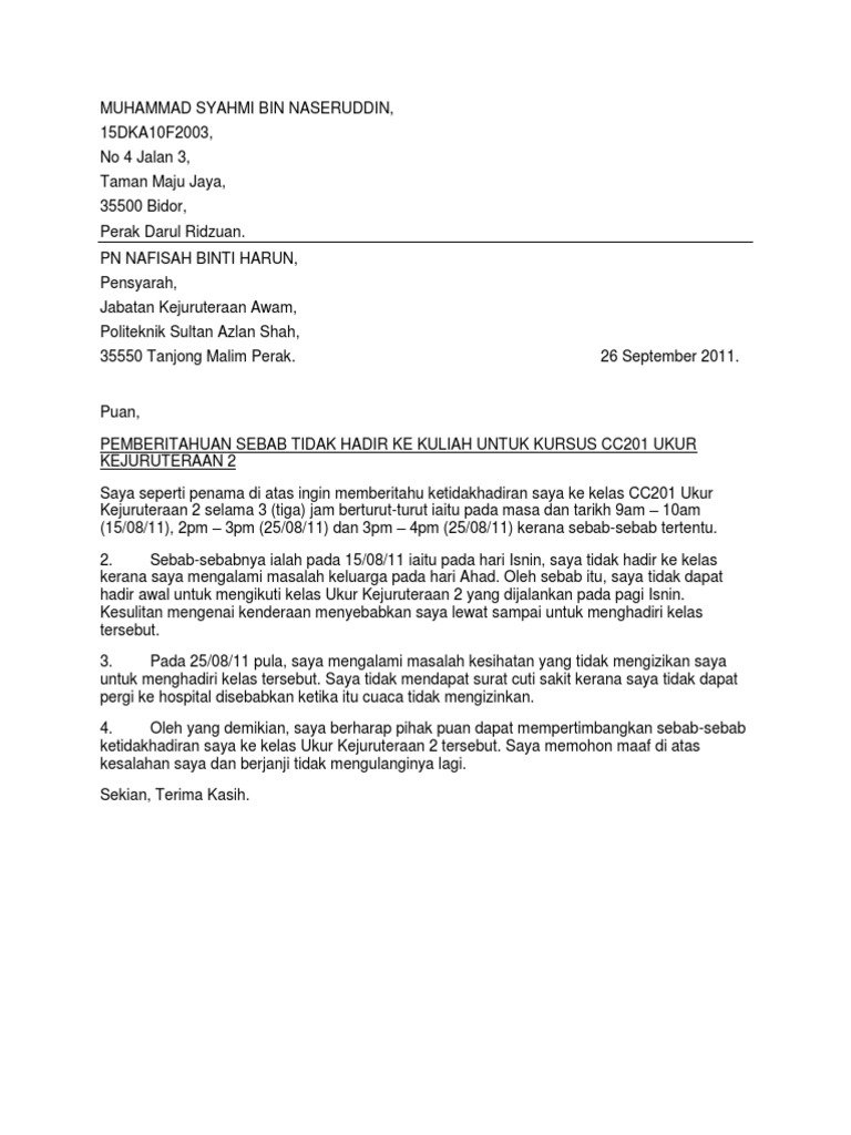 Download surat ketidakhadiran ke kuliah. Contoh surat tidak hadir kuliah. Perkara di atas adalah dirujuk. Surat izin kuliah karena kegiatan ukm contoh surat izin ke dosen imenyampaikan permohanan maaf atas ketidakhadiran pada kelas manajemen kreatif i hari ini. Surat rasmi cuti sakit universiti kosong kerjo.